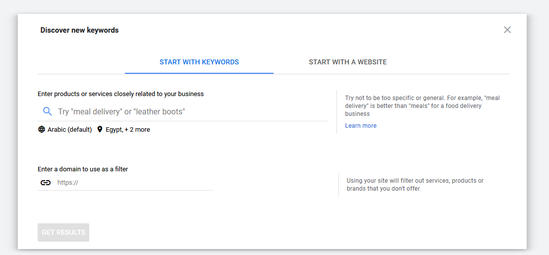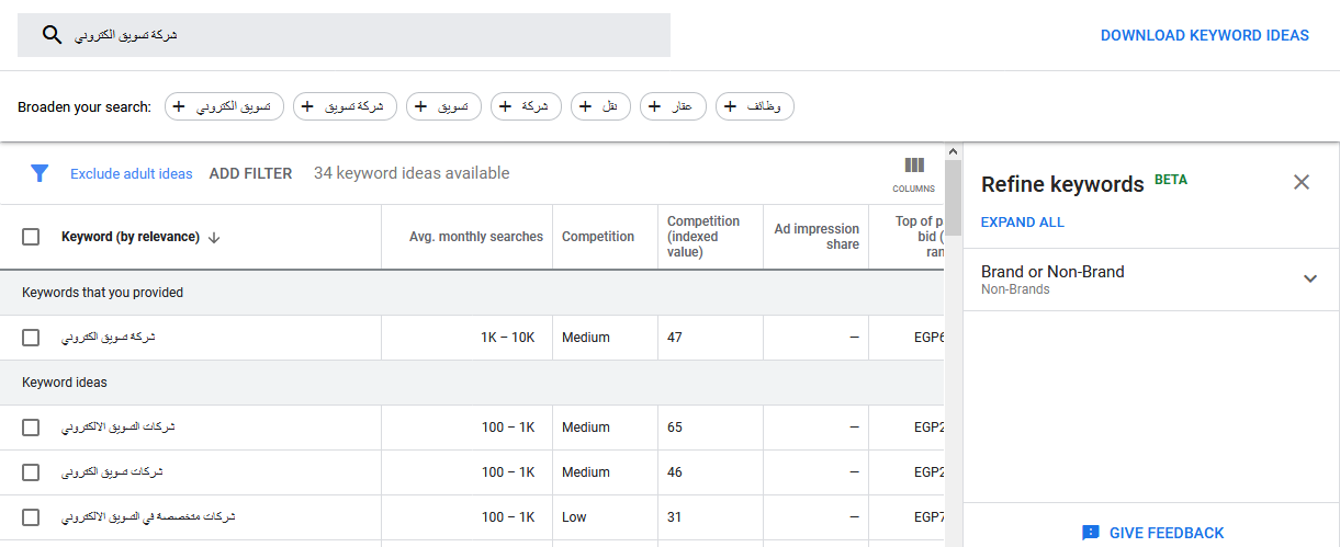 بعض الضغط على الاختيار الاول Discover new keywords أو ان تجد المزيد من الافكار لكلمتك عبر استخدامك لـ كيورد بلانر أو جوجل كيورد تول سوف تتغير الشاشة الحالية إلي هذه الشاشة التالية.