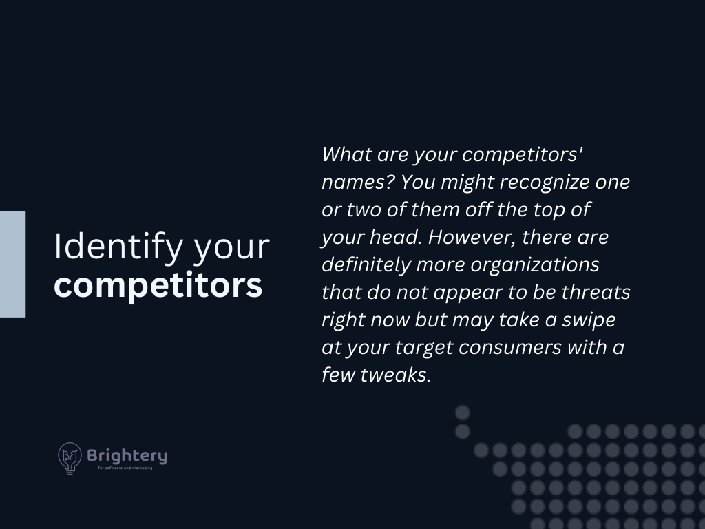 What are your competitors' names? You might recognize one or two of them off the top of your head. However, there are definitely more organizations that do not appear to be threats right now but may take a swipe at your target consumers with a few tweaks.