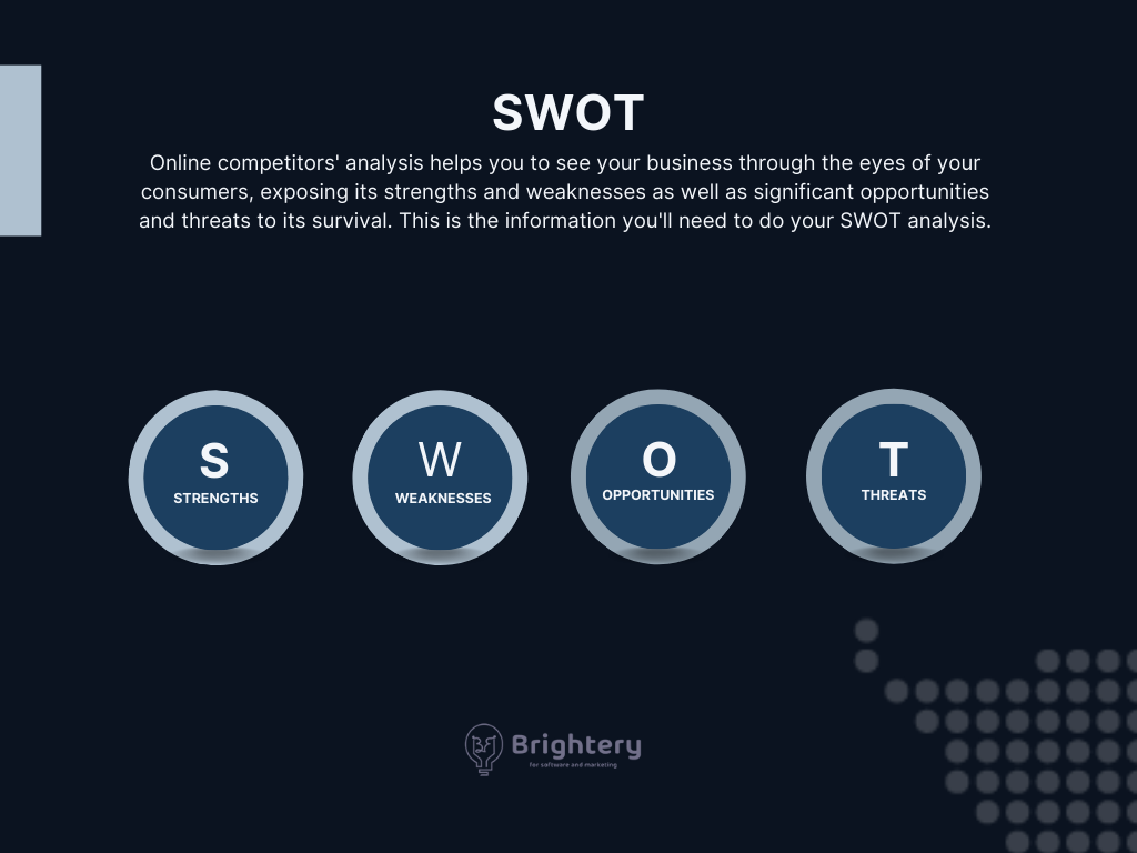 Online competitors' analysis helps you to see your business through the eyes of your consumers, exposing its strengths and weaknesses as well as significant opportunities and threats to its survival. This is the information you'll need to do your SWOT analysis.